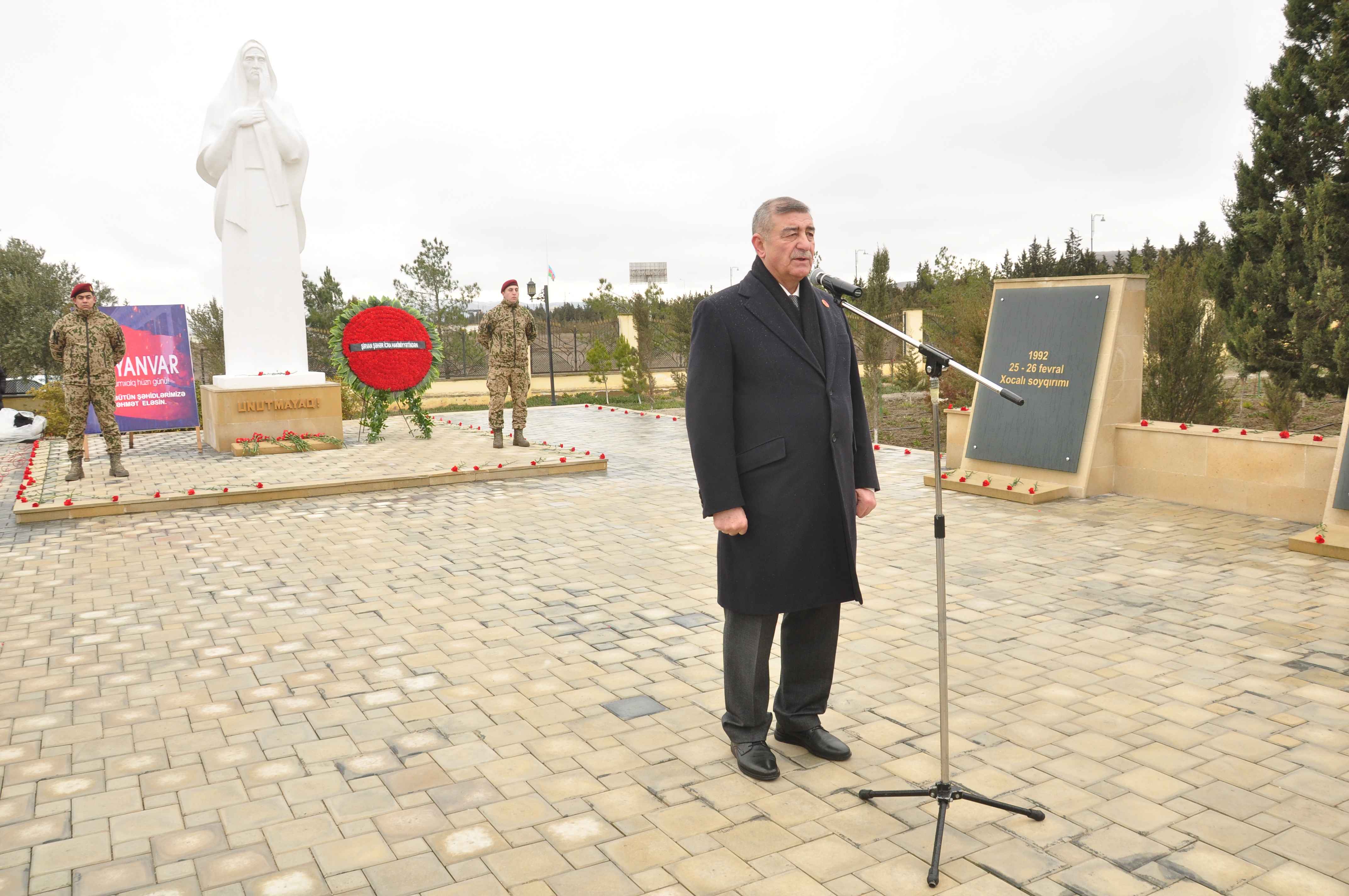 “Şəhid Anası” memorial abidə kompleksinin qarşısında davam edən tədbirdə çıxış edən şəhər İcra Hakimiyyətinin başçısı İlqar Abbasov 1990-cı ilin yanvar ayının 19-dan 20-nə keçən gecədən başlayaraq Azərbaycanın suverenliyi, azadlığı uğrunda mübarizəyə qalxmış dinc sakinlərə qarşı sovet qoşunlarının törətdiyi cinayətlərdən bəhs edib. Qeyd edib ki, 20 Yanvar hadisələri Azərbaycan xalqının tarixində faciə olmaqla yanaşı, milli qəhrəmanlıq səhifəsidir. Ümummilli Lider Heydər Əliyev 1990-cı il yanvarın 21-də Azərbaycanın Moskvadakı daimi nümayəndəliyinə gələrək keçirdiyi mətbuat konfransında SSRİ rəhbərliyinin Bakıda törətdiyi qanlı qırğını kəskin şəkildə pisləyib, bu hadisəni Azərbaycan xalqına qarşı ağır cinayət adlandırıb, baş verənlərə siyasi qiymət verilməsini və günahkarların cəzalandırılmasını qətiyyətlə tələb edib. Həmçinin Azərbaycan xalqının başına gətirilən bu faciəyə ilk siyasi-hüquqi qiymətin də Ümummilli Lider tərəfindən verildiyini diqqətə çatdırıb.